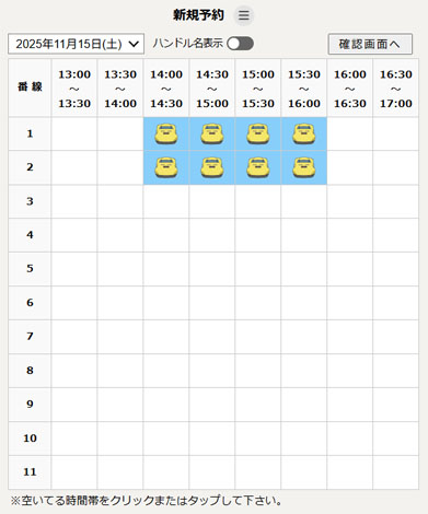 上記の例では11月15日の1番線と2番線をそれぞれ2時間(14:00~16:00)を選択しています。